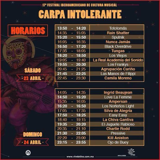 Les compartimos los horarios de la Carpa Intolerante para que así terminen por armar su itinerario. Recuerden 23 y 24 de abril Festival Vive Latino.